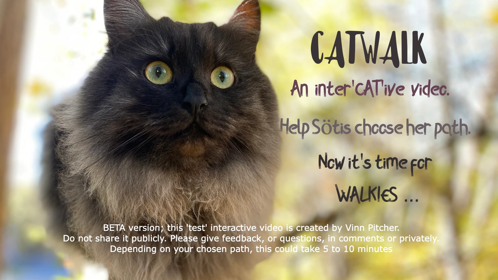 Walkies ! It's time to go out, and there are so many choices a cat can make. Help Sötis the Siberian to explore her surroundings by choosing the path she walks.